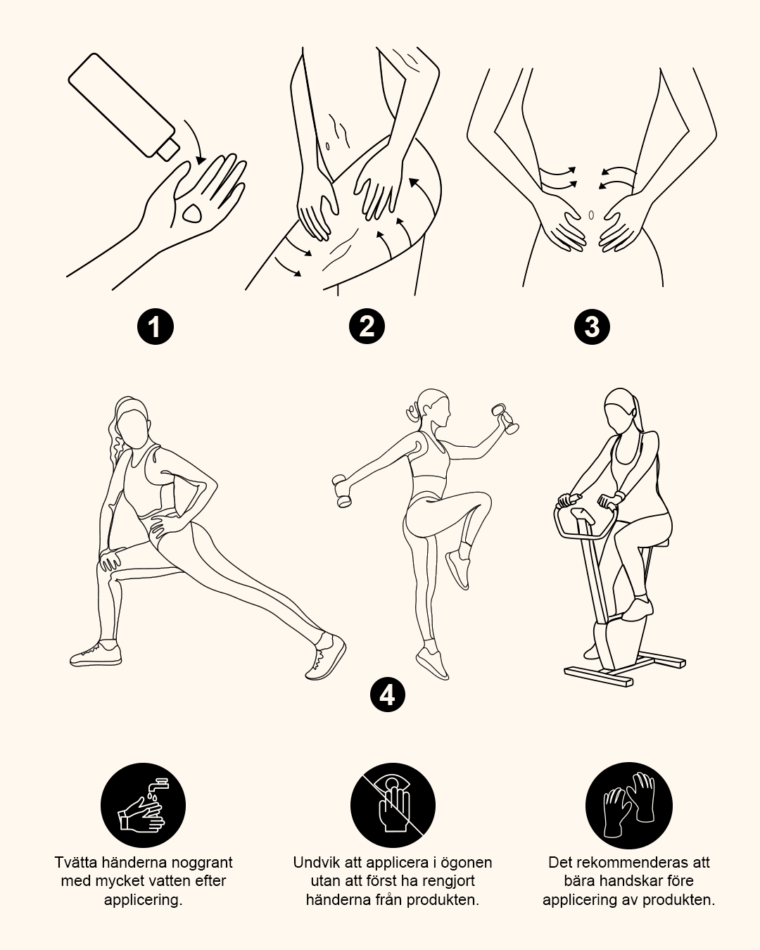 Applicera in önskad mängd av produkten på det önskade område du vill behandla och massera så mycket du behöver. För bästa effekt rekommenderas att du går eller rör på dig i cirka 30 minuter efter applicering, för att få upp blodcirkulationen som sedan ger effekt i 24 timmar.